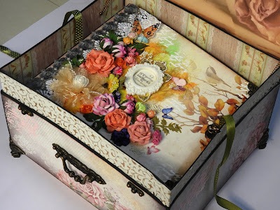Box has a top mixed media layout with beautiful metal accessories like legs, locks and handle.